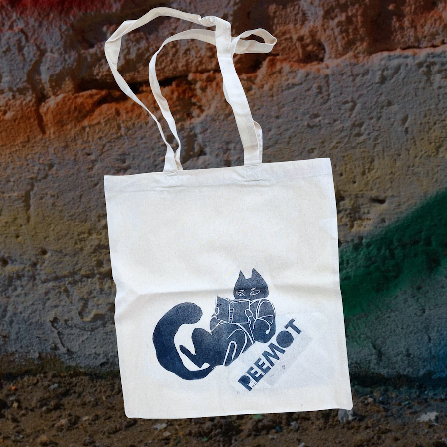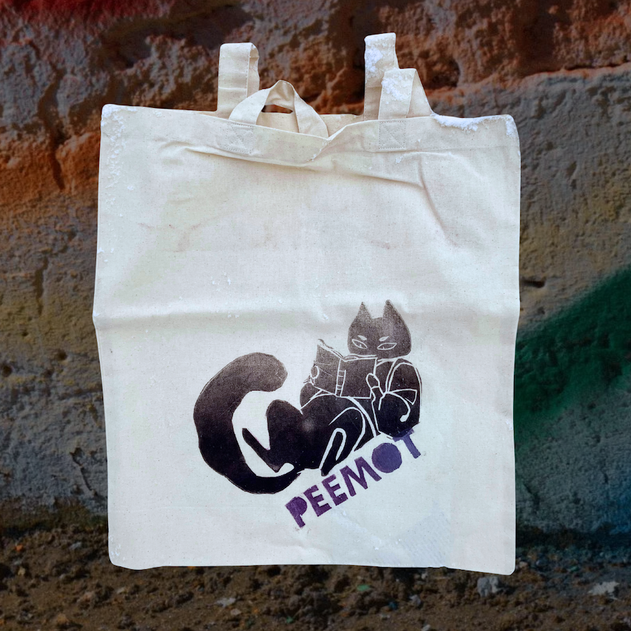 Käsitsi trükitud suur kott, suurus ca 35 × 35 cm. Kõik tooted on loodud Peemoti vabatahtlike poolt. Meilt ostes aitad Peemoti keskust!