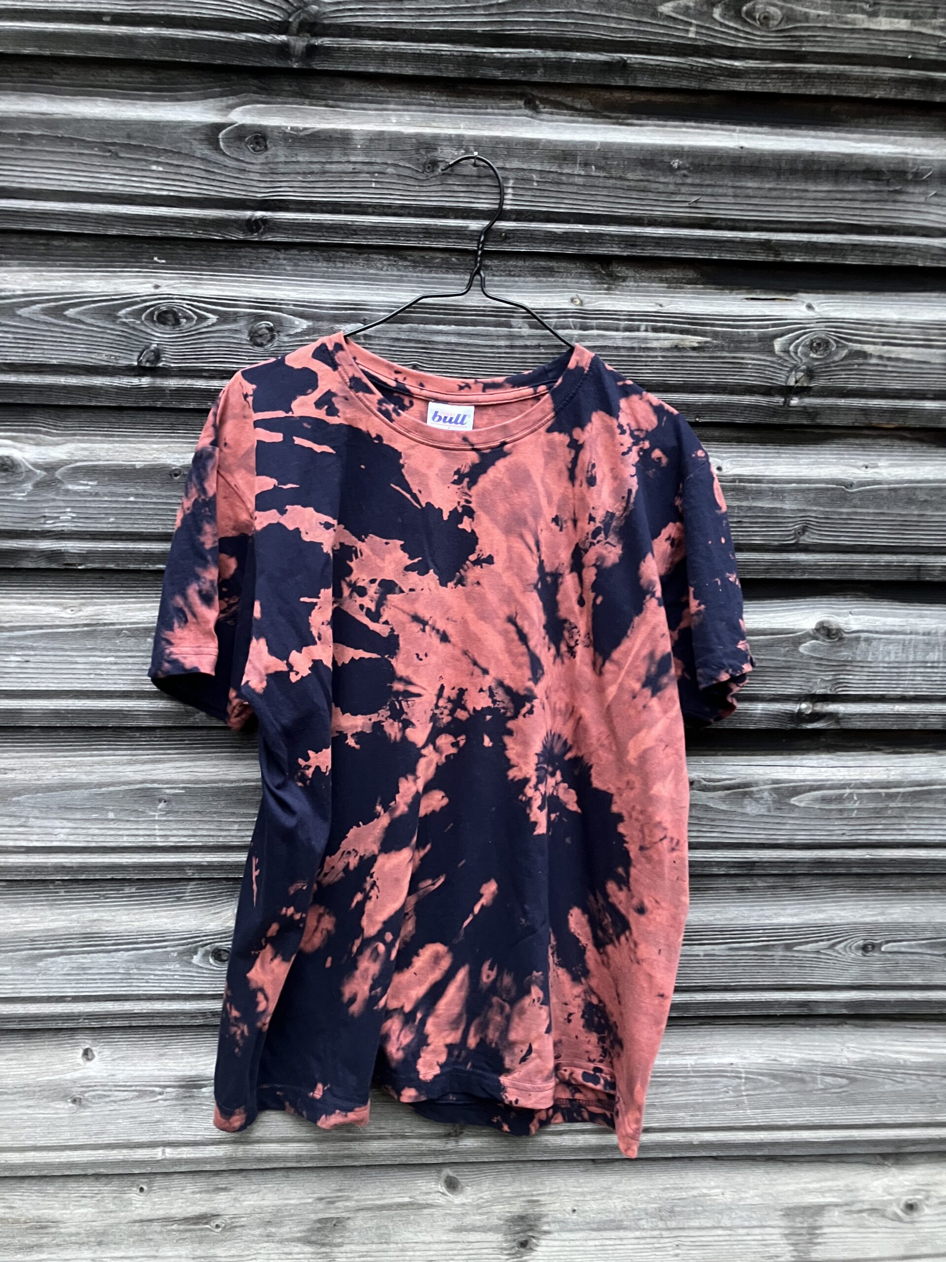 Käsitsi värvitud ja trükitud “tie-dye” t-särk, ostetud kasutatult. Logo on tagaküljel. Kõik tooted on loodud Peemoti vabatahtlike poolt. Meilt ostes aitad Peemoti keskust!