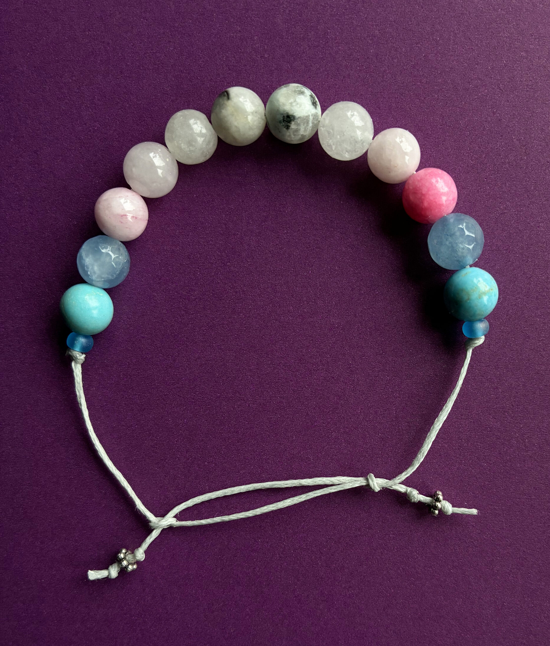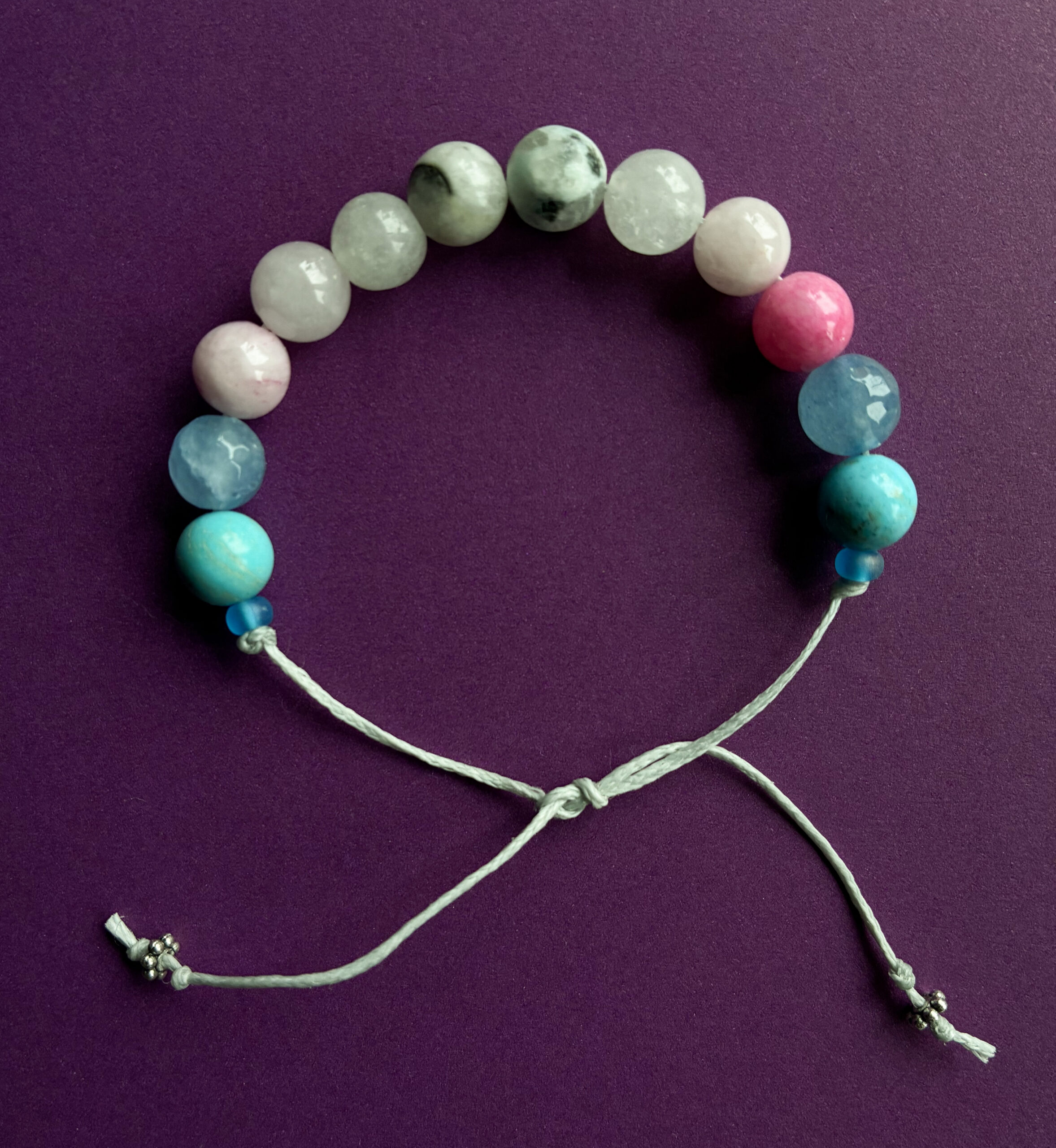 Käevõru translipu värvides. Poolvääriskividest helmed, vahatatud niit, klaas- ja metallhelmed. Pikkus on reguleeritav(~19-23cm).